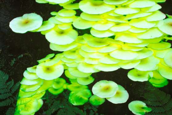 The glowing forest of Shikoku, Japan, features a variety of luminescent mushroom that emit lights, giving them a spectacular appearance. The mushrooms are usually found in clusters on dead stumps and logs.