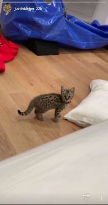 The family’s new feline, who appears to be a Savannah, playfully leaped and frolicked on Justin’s bed as he reclined under his blanket and watched TV in one of the two videos he posted to social media.