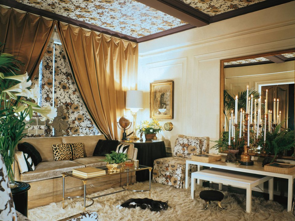 With a shag rug and a floral, printed ceiling to match the love seats and drapes, this room practically screams 1960s.