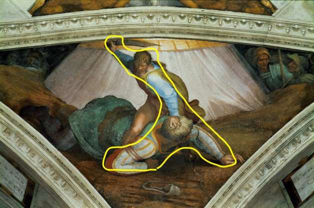 This wouldn’t be one of Michelangelo’s paintings if he wasn’t hiding some details in this particular scene. First of all, he put Davis intentionally in that position, in the shape of the letter ”gimel” which means “strength” in the mythical Kabbalah culture.