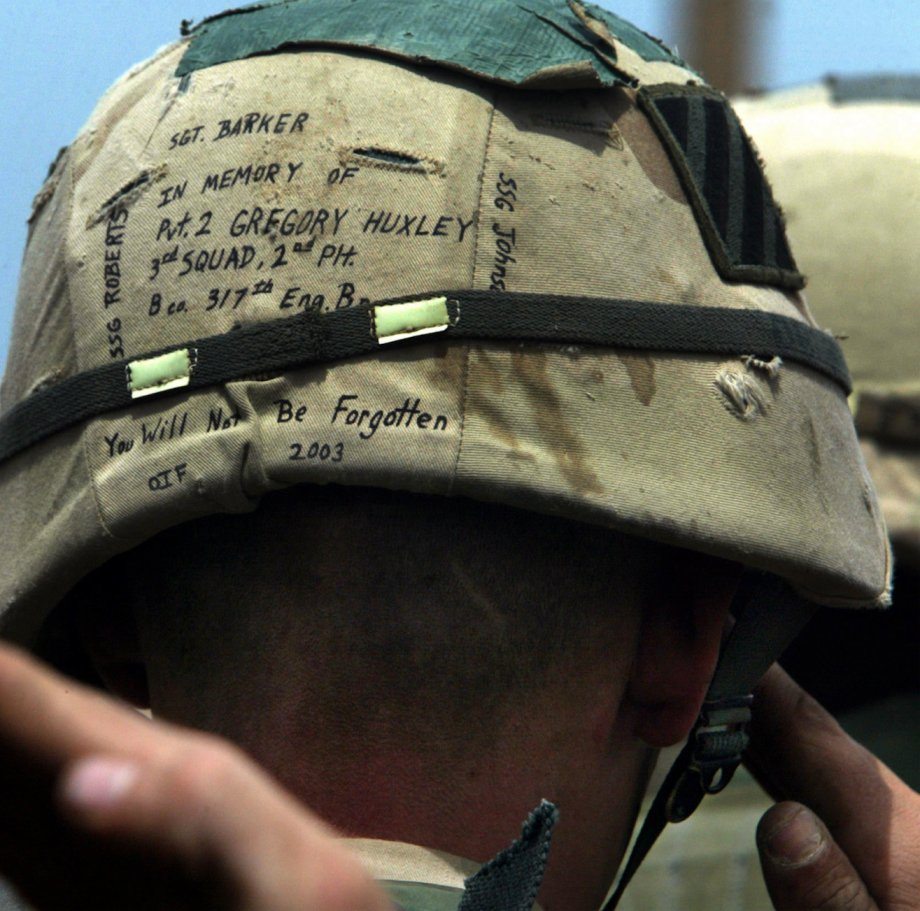 A solider inscribed his helmet in the memory of his fallen comrade.