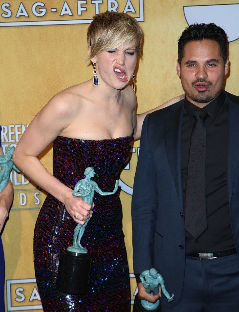 Jennifer Lawrence and Michael Peña goof off for pictures after the Screen Actor Guild Awards in 2014. Jennifer Lawrence has had a terrific career so far, and is only growing. She is the highest paid actress in Hollywood and yet is only 26. But the underrated Peña might be one of the best Latino actors in Hollywood right now. He has shown off his talents in comedy, action, and many various dramas. He has been married to Brie Shaffer since 2006, and has a daughter with her. He is of Mexican-American decent, and has been in 5 films nominated for best picture already. Extremely well liked by peers throughout his career, he always has fun and is super friendly in interviews.
