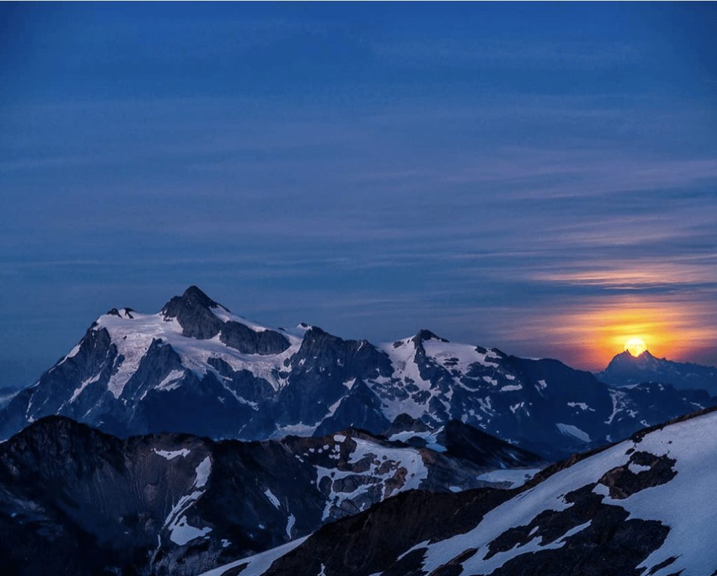 Full moon rising over the North Cascades at dusk. Smoke from a nearby wildfire created haze that created this erie moonrise. Erosion from glaciers has formed the North Cascades into one of the steepest and most rugged mountain ranges in the lower 48. Some peaks have an astounding 8,000+ feet of elevation gain, like Mt. Shuksan on the left side of this image which rises 8,400′ on it’s south side. Photo @stephen_matera