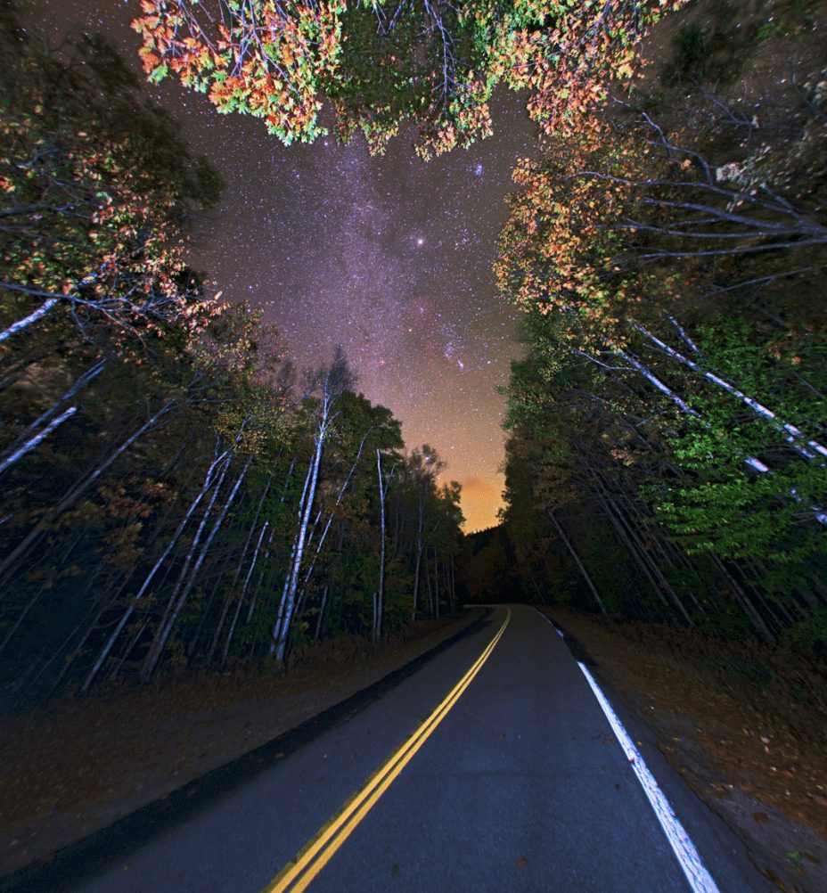 A night drive into the New England fall colors. In this ultra wide-angle view the Milky Way and prominent winter stars are framed between maple leaves in New Hampshire. Bright planet Jupiter is in the center and yellow light dome of a faraway city glows on the horizon.