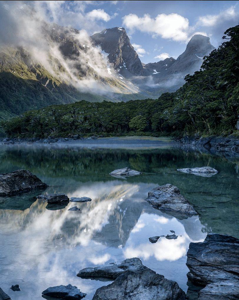 Lake Mackenzie along the Routeburn Track, South Island, New Zealand. The Routeburn is a popular 20 mile trek through the Southern Alps. There are four maintained huts along the Routeburn, including one right next to Lake Mackenzie. The trek crosses through both Mount Aspiring National Park and Fjordland National Park.