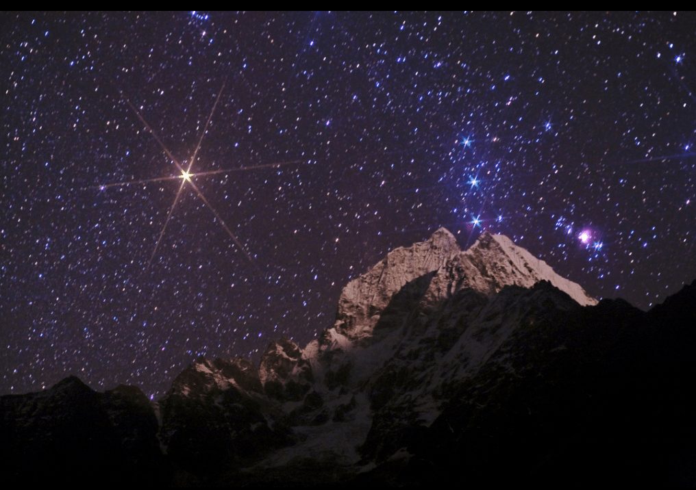 Stars above Himalayas in a crystal clear night of Nepal. The last lights of the setting moon on the other horizon shines on Mt Thamserku (6623 meters) not far from Everest. Constellation Orion, the Hunter, with the Orion Nebula (right) rises above the World Heritage Sagarmatha National Park.