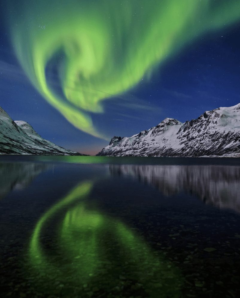 The World at Night project. The aurora borealis (northern lights) reflected in a fjord. Taken near Tromso in northern Norway on this late March night.