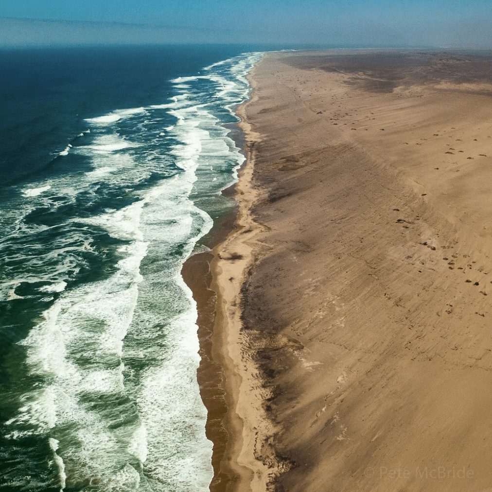 An abstract landscape. The golden sand dunes of Namibia’s Skeleton Coast catch the last rays of sunlight. The local Bushmen tribes of Namibia call this region “the land God made in anger,” while 15th Century Portuguese sailors, the first explorers to the region, dubbed it as “The Gates of Hell” because of its harsh conditions. But sometimes the harshest of places hold incredible beauty.