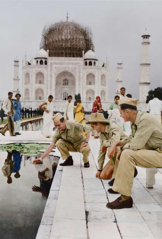 In 1942, during WW II, the Taj Mahal is partly covered in bamboo scaffolding to disguise it from enemy bombers. In front of it, Private First Class John C. Byrom, Jr., of Waco, Texas, is trying to catch a goldfish in the marble-lined pool. Corporal Anthony J. Scopelliti and Private First Class Ray Cherry are watching him try.