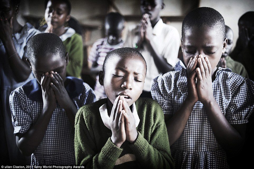 At a school, children in uniforms pray earnestly in the early morning before classes commence – Uganda