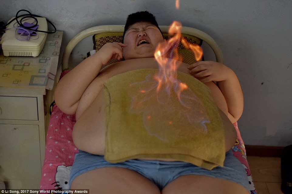 Picture taken at Changchun weight loss centre where this kid undergoes traditional Chinese treatments including fire therapy, burning a mixture of ingredients on a cloth over his stomach – Changchun, China