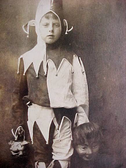 A kid in his Halloween costume holding his mask at his side in the US in 1930