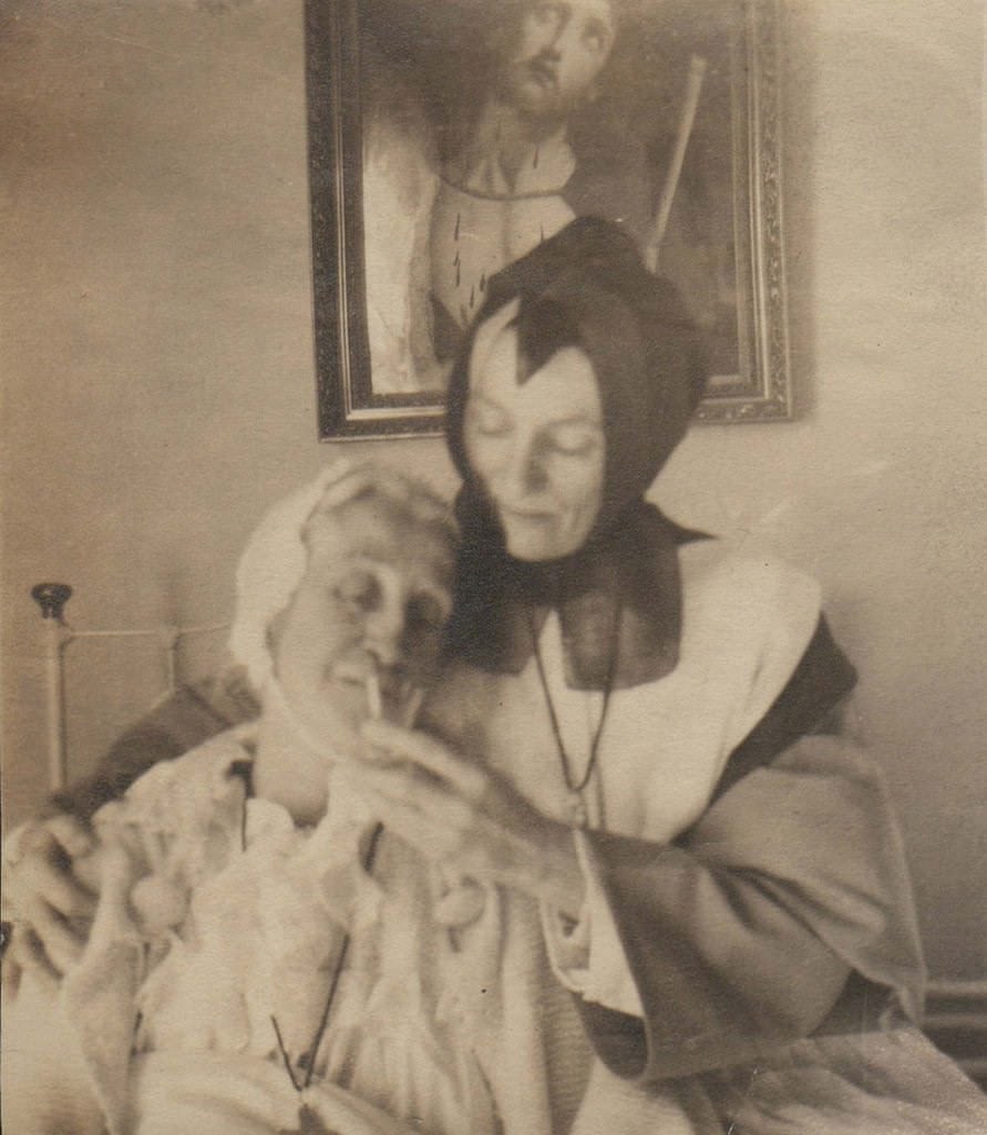 A nurse helps a patient with Jesus looking a little uncomfortable in Spain in 1934