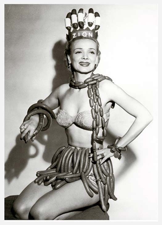 Geene Courtney, Queen of National Hot Dog Week 1955, a pageant sponsored by (shocker) the Zion Meat Company