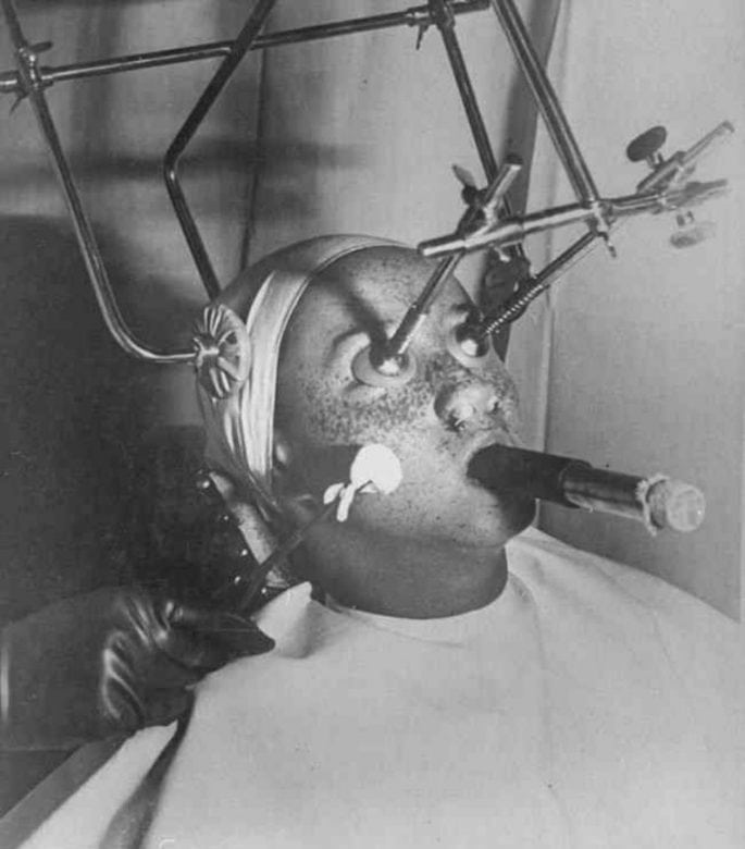 A patient receives an antiquated anti-freckle treatment, 1933.