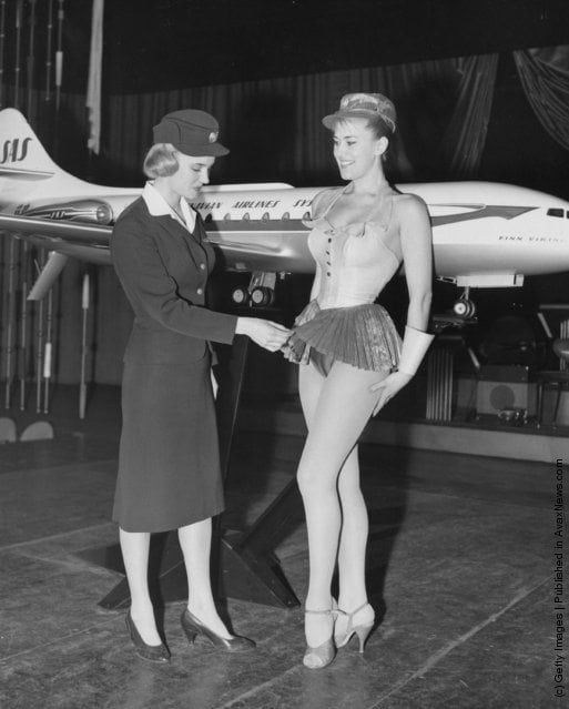This Swedish airline stewardess, Brigitta Lindman, is having a closer look at the showgirl’s costume after rumors of similar skirts for air hostesses spread in Sweden in 1959.
