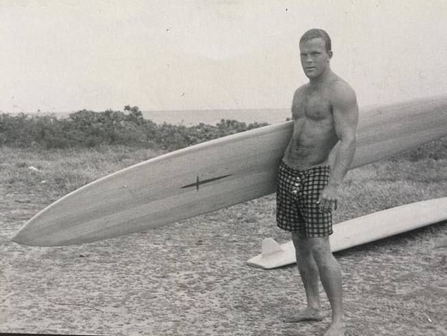 Legendary surfer, Buzzy Trent is getting ready to catch his next wave in 1955. Buzzy is seen holding his Hawaiian “Gun” surfboard, designed for big waves.