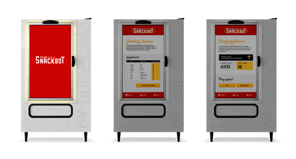 The Snackbot is a reimagined vending machine transformed into an innovative tech experience. The machine quizzes Campbell’s Soup employees on the renowned company’s history, product offerings and digital marketing efforts. If an employee accepts the challenge and answers two out of three questions correctly, Snackbot instantly dispenses a delicious reward from Campbell’s product portfolio.