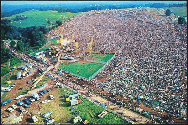 Aerial view of over 400,000 people at the Woodstock Music Festival, New York, 1969.