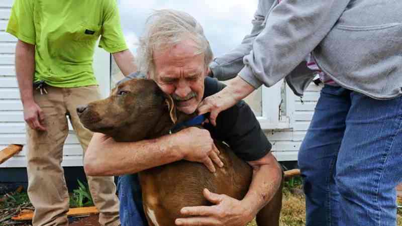 An Alabama man reunites with his pet following a devastating series of tornadoes, March 2012.