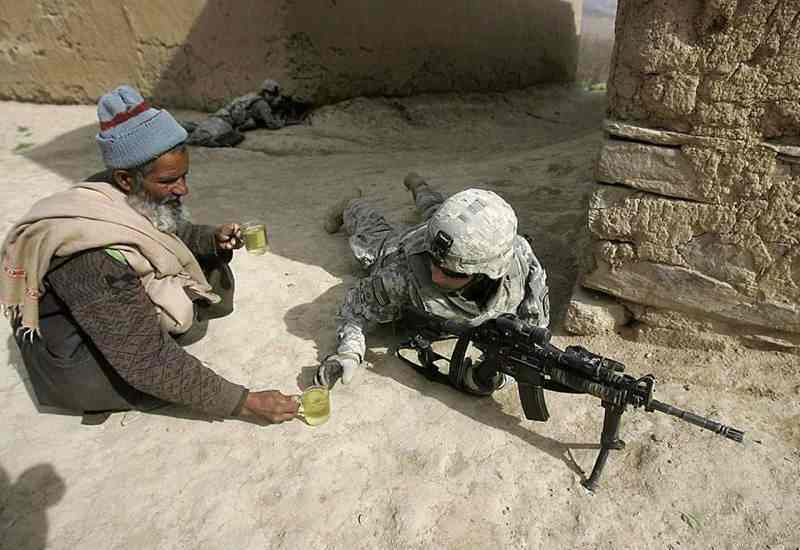 An Afghan man offers a US soldier tea near Kabul, Afghanistan, 2009.