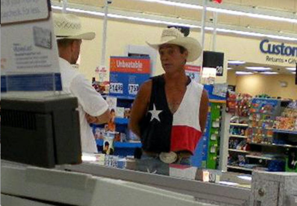 It’s no secret that people from Texas are proud to be from the Lone Star state, and they’ll take every opportunity to show it. The cowboy hat and big belt buckle were more than enough, but where else would he wear his Texas flag vest if not to Walmart?
