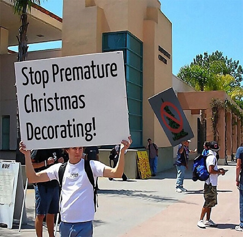 Did you ever think you would stumble onto a protest about decorating? Yeah, we did not either! However, someone actually organized one and they feel very strongly about how early you decorate for Christmas. We do agree that some people are a bit overzealous when it comes to Christmas decorations, but calling it premature like you are talking about a baby is hilarious.