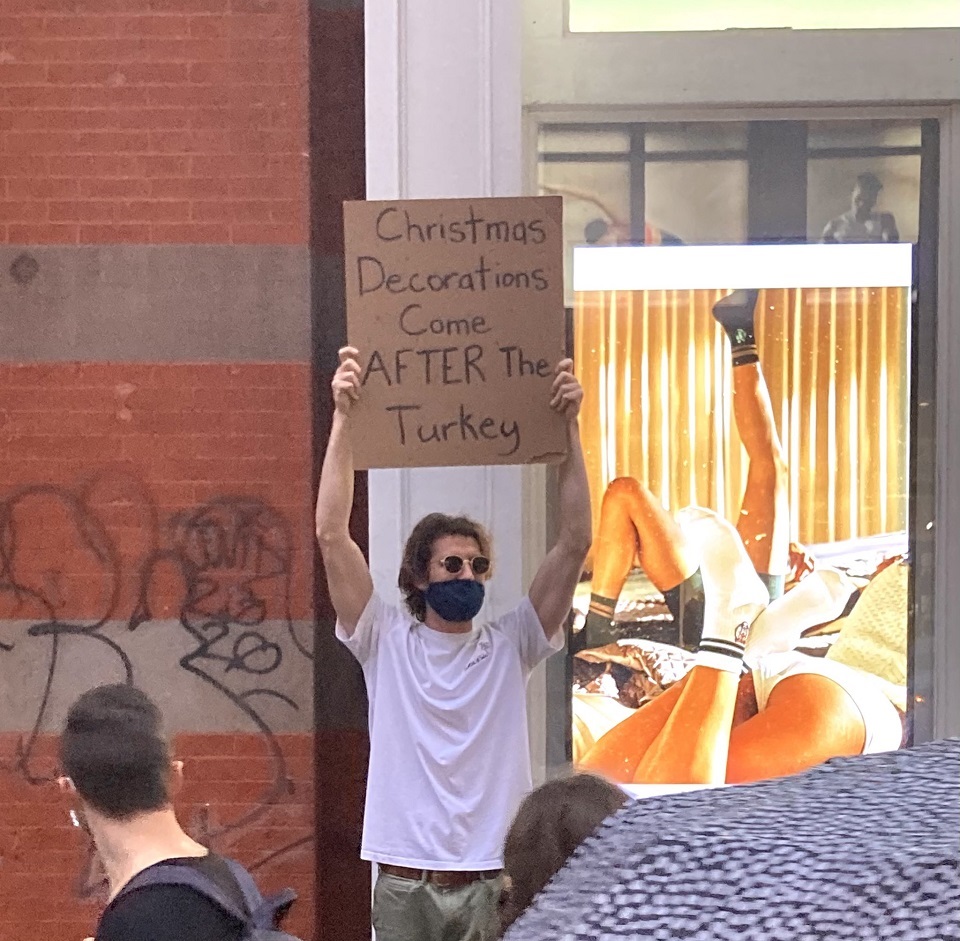 Our favorite protester is back! And this time he echoes the sentiment of the ‘Premature Decorators’ protest! We think he does have a point and it is presented better than the one before him. People make such a big thing out of Halloween and then they jump right into Christmas, forgetting to spare some thought to poor old Thanksgiving.