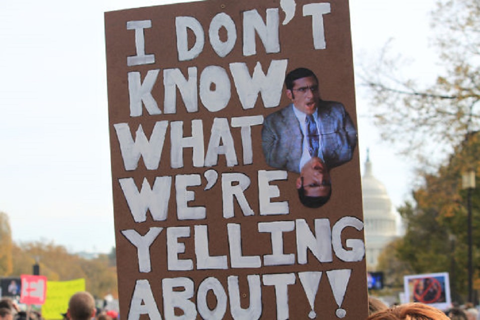 Everyone who ever attended a protest knows just how loud it can get with all participants yelling and chanting. We do not know if this individual was there to make a joke or to honor The Office, but it definitely served as comic relief.