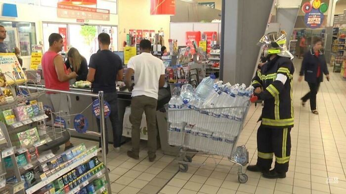 Well, at least let the man ahead. He’s obviously having an emergency. But I can’t neglect the fact that this is a very expensive way to put a fire out. Also, what you don’t see in this picture, is ten other firemen waiting in line with their cart full of bottled water.