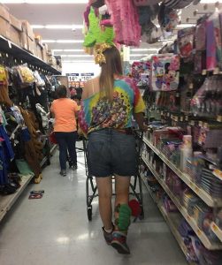 We have seen some pretty strange outfits on shoppers down the aisles of Walmart but this one is perhaps the most questionable. While we can deal with the off-the-shoulder tie dye shirt and the large gold hair bow, it’s the stuffed centipede on her leg which is really concerning us. Maybe she had a certain fondness for the insect and it’s just something she always incorporates into her outfit every day? It would probably be more appropriate for a young child.