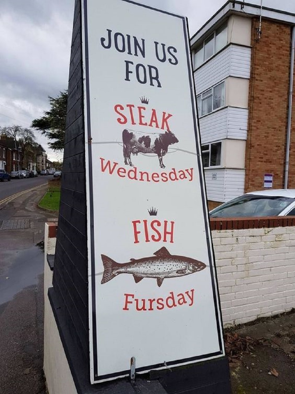 Yet, if you advertise your fish as being served on “Fursday” you may not make such a good impression. Truly, they could have changed the day to Friday and everything would have worked well! Unless their fish is truly furry…