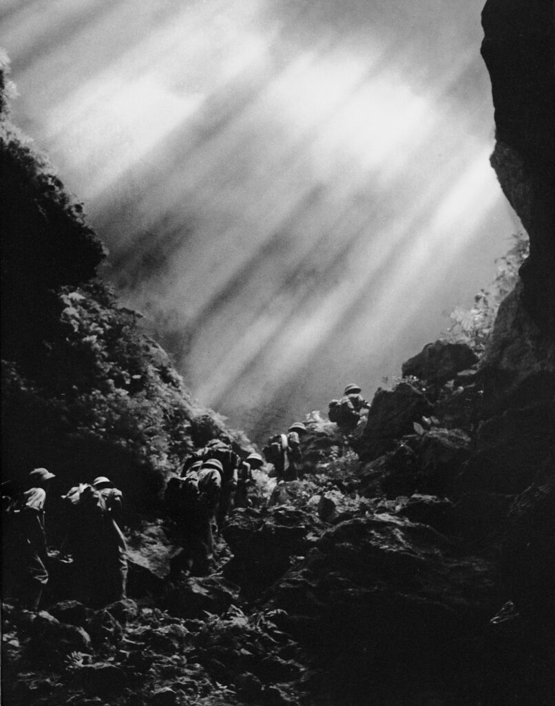 Troops walk the Ho Chi Minh Trail in the Truong Son Mountains, which form the 750-mile-long spine of Vietnam, stretching along much of the country’s western border. To the soldiers of the North, the Ho Chi Minh Trail was known as the Truong Son Road.